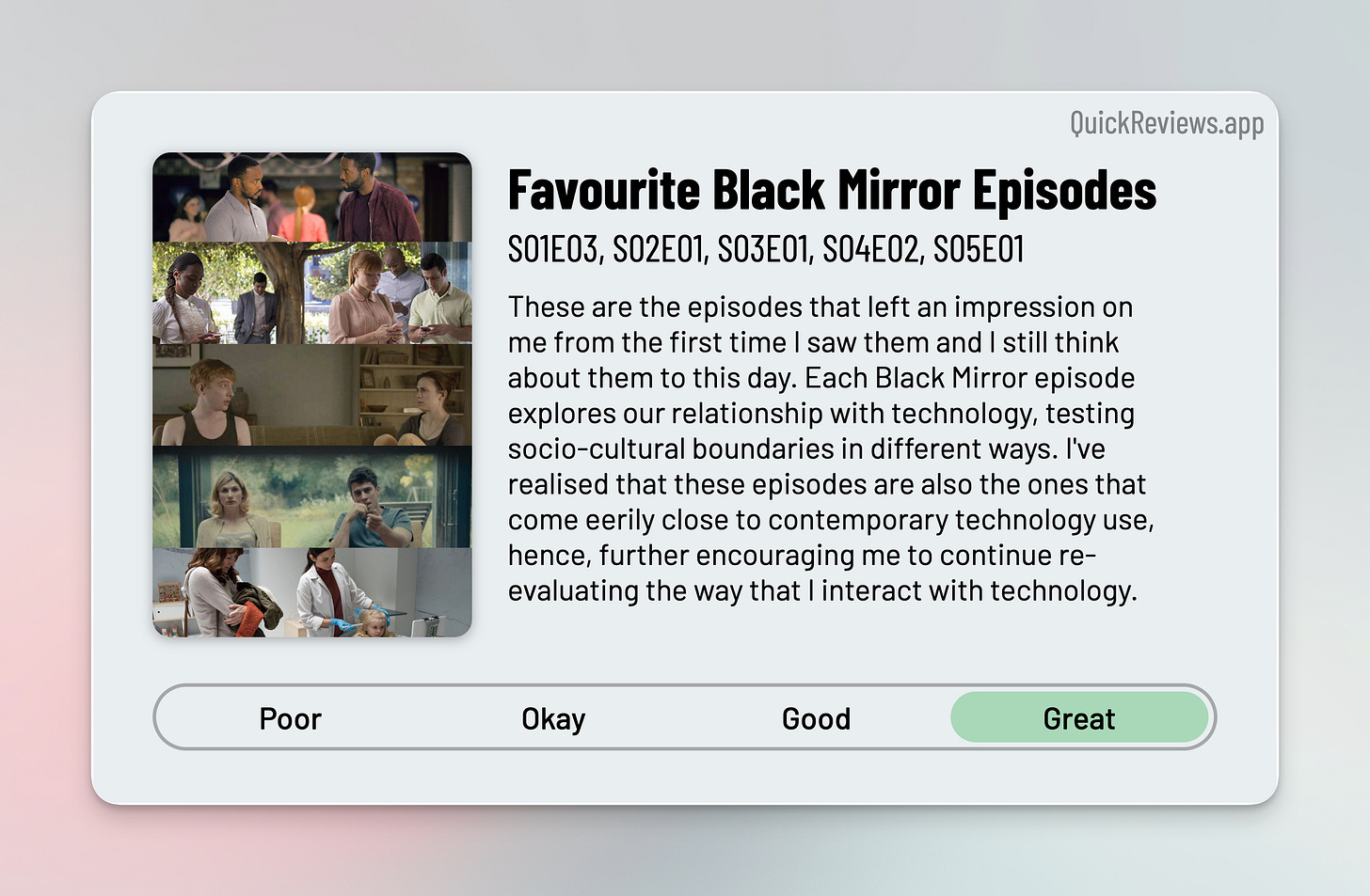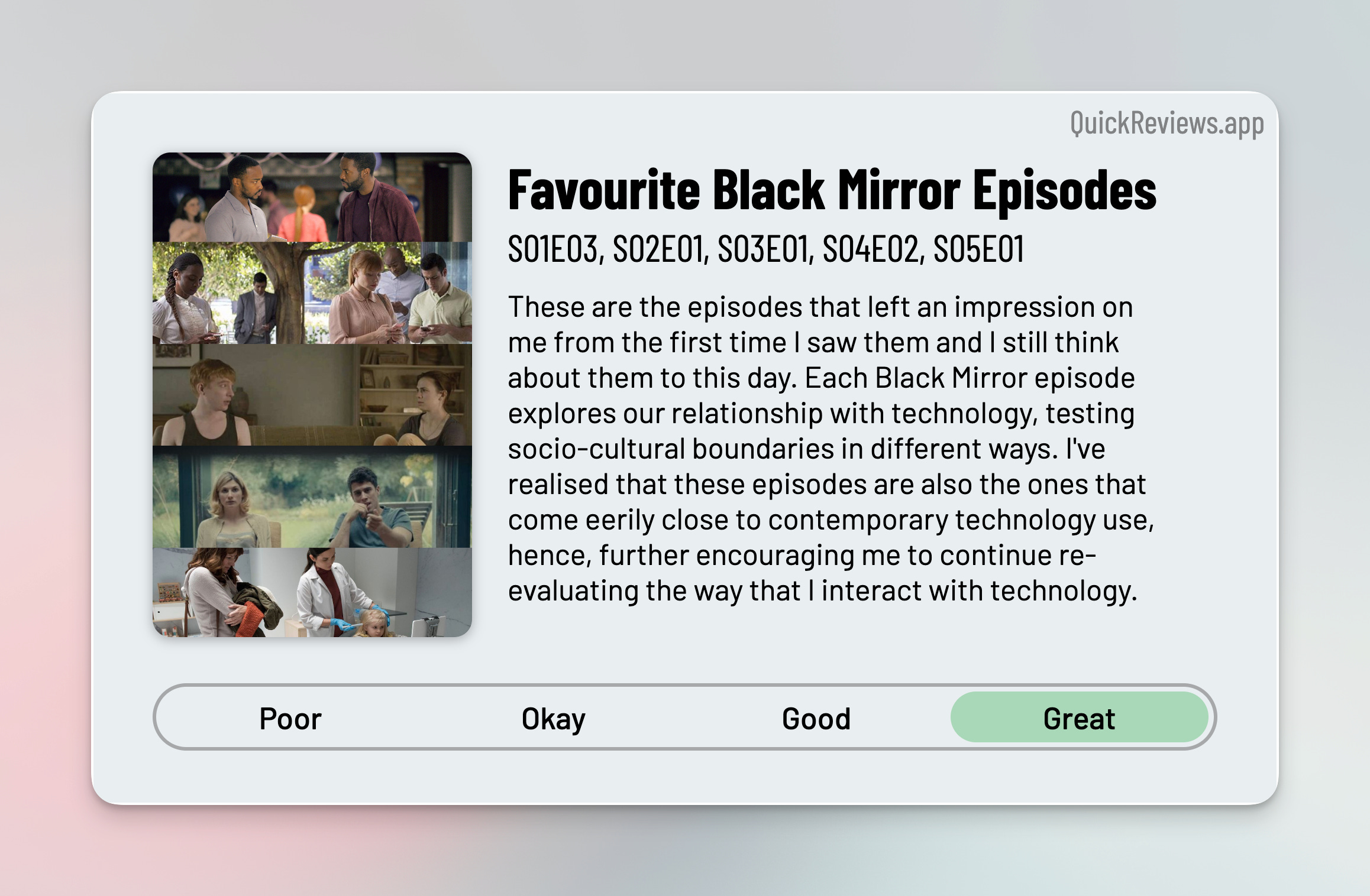 I re-watched my favourite Black Mirror episodes during the week and thoroughly enjoyed each one.