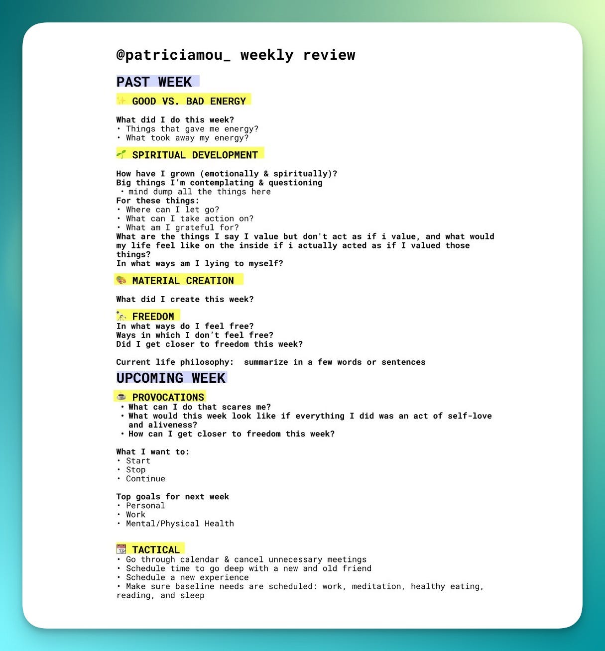 I hope you've had a good week and even if it was truly terrible, I hope that we can find the glimmers of hope through the gloom. This week, I thought it would be fun to do Patricia Mou’s personal weekly review right here. I came across Patricia’s work via Twitter a few months ago and have since enjoyed and found value in her newsletters and insights spanning creativity, philosophy and mental health.